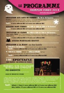 14h Atelier / Initiation. Initiation aux arts du cirque, au clown, ateliers baby cirque, maquillage. Initiation à la Magie avec Rémi Gandrille 19h Spectacle 1ère partie avec les écoles de cirque suivi de « Sur le Banc » de la Cie Girouette.Réservations M.L.C. : 04 73 68 45 02